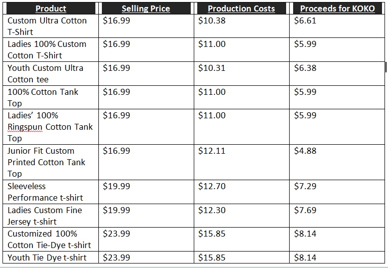 Please note the money that goes to KOKO differs from the price you pay. Production costs need paying too. The chart below crunches the numbers for you. So you can see exactly where your money goes.