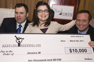 KOKO Executive Director Dave Kunicki and President Tim Wambach present Jessica a check for buying a new wheelchair. KOKO stepped in after Jessica’s insurance company denied her a replacement.
