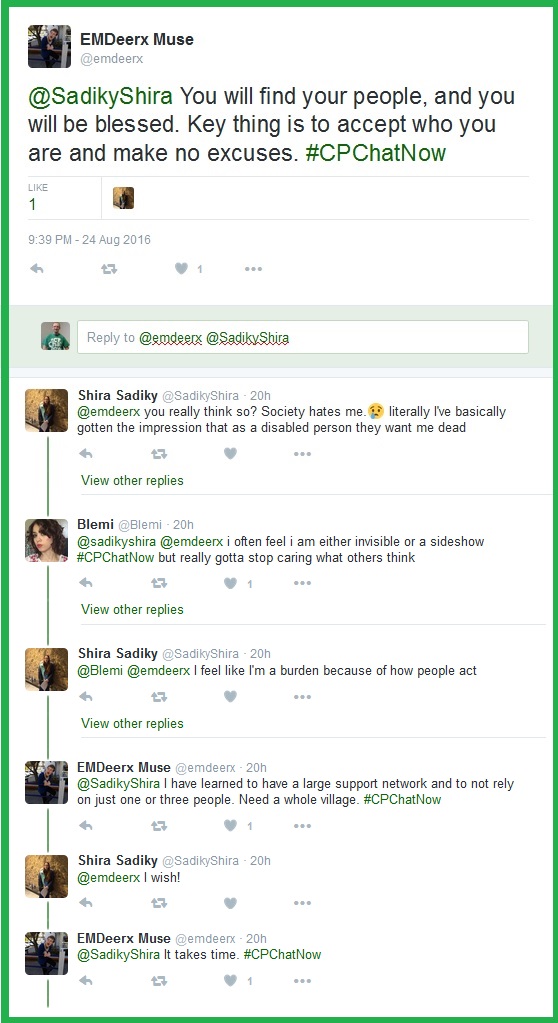 Obviously participating in the weekly cerebral palsy Twitter chat supplies the best way to utilize our support network. Still my co-host Blake Henry and I know not everyone tweets. Hence we work hard to provide other platforms for community contribution.