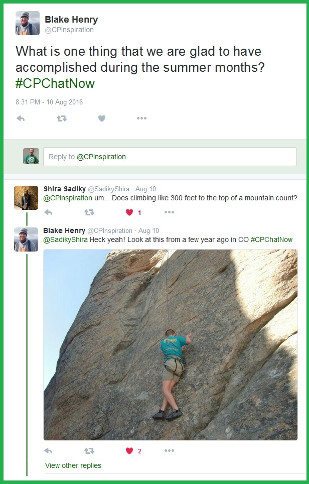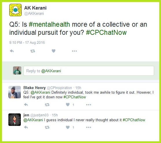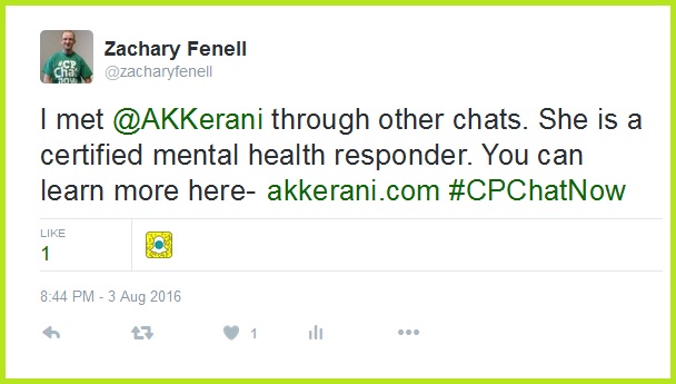 Before wrapping up I wish to revisit a point captured in an above screen shot. Participants expressed how #CPChatNow reduced feeling lonely. That speaks to a support system’s importance, something emphasized again later in the night.