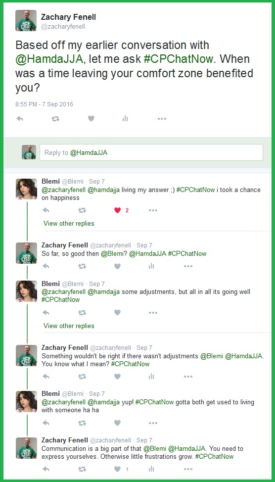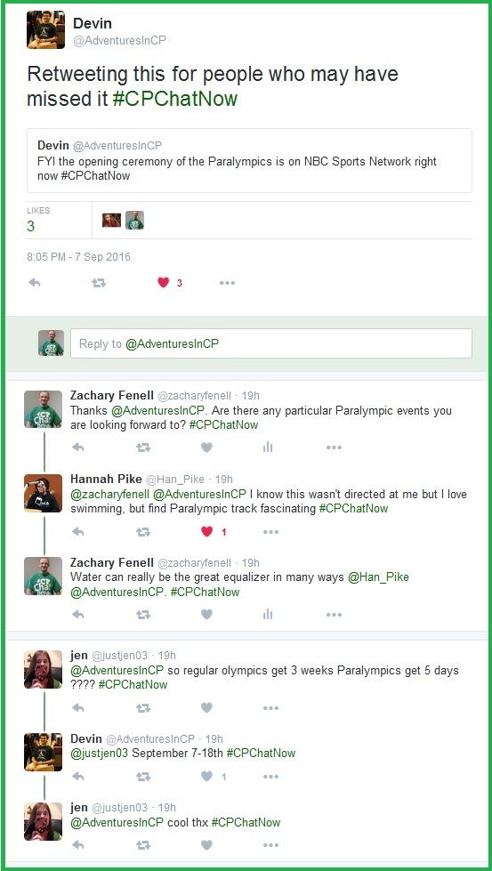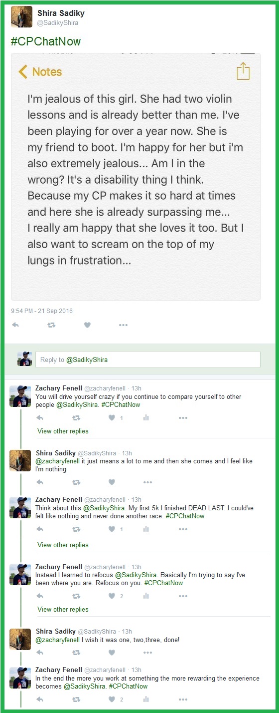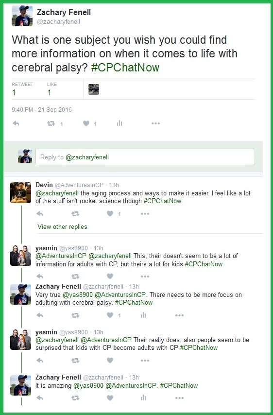 If need advice on life with cerebral palsy, join our Twitter chat Wednesdays, 8pm ET. Or, checkout the #CPChatNow Facebook fan page. Message us so we can discuss posting your question to the Facebook page.