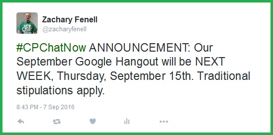 Additionally I shared some community news, officially announcing our September 2016 Google Hangout date.