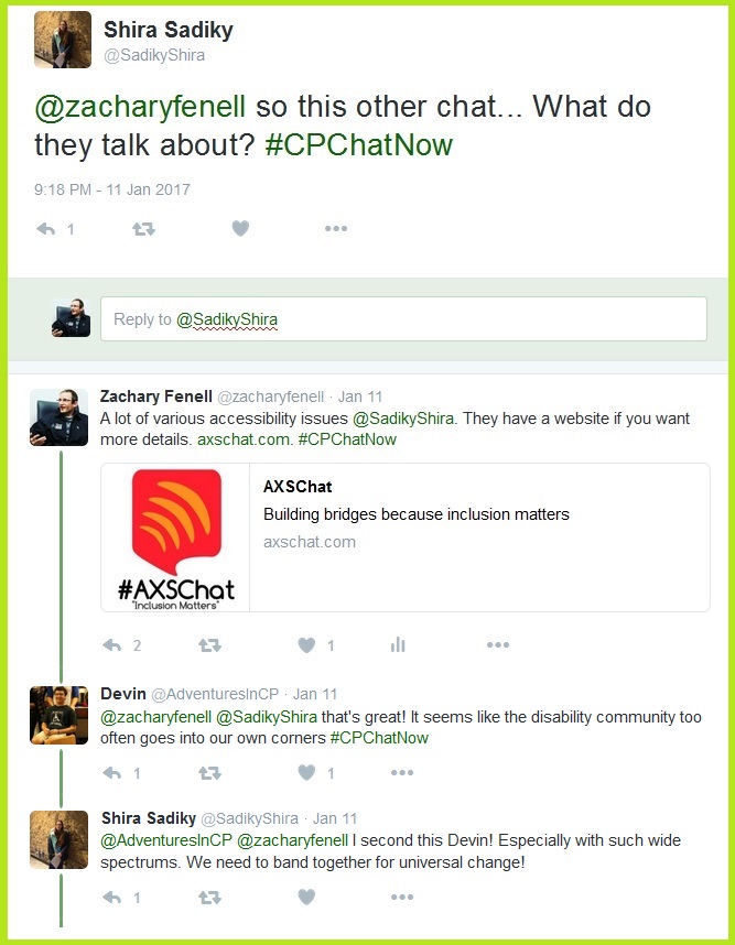 Co-host Zachary Fenell tells #CPChatNow about #AXSChat.Like Shira, I also agreed with Devin‘s comments “the disability community too often goes into our own corners.” I encourage anyone from #CPChatNow to join #AXSChat (if your schedule allows). #AXSChat takes place Tuesdays at 3pm ET. For more information visit their website, axschat.com.