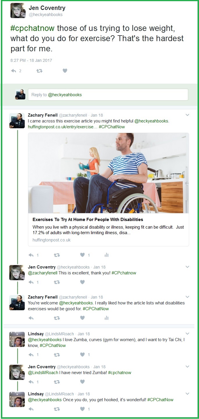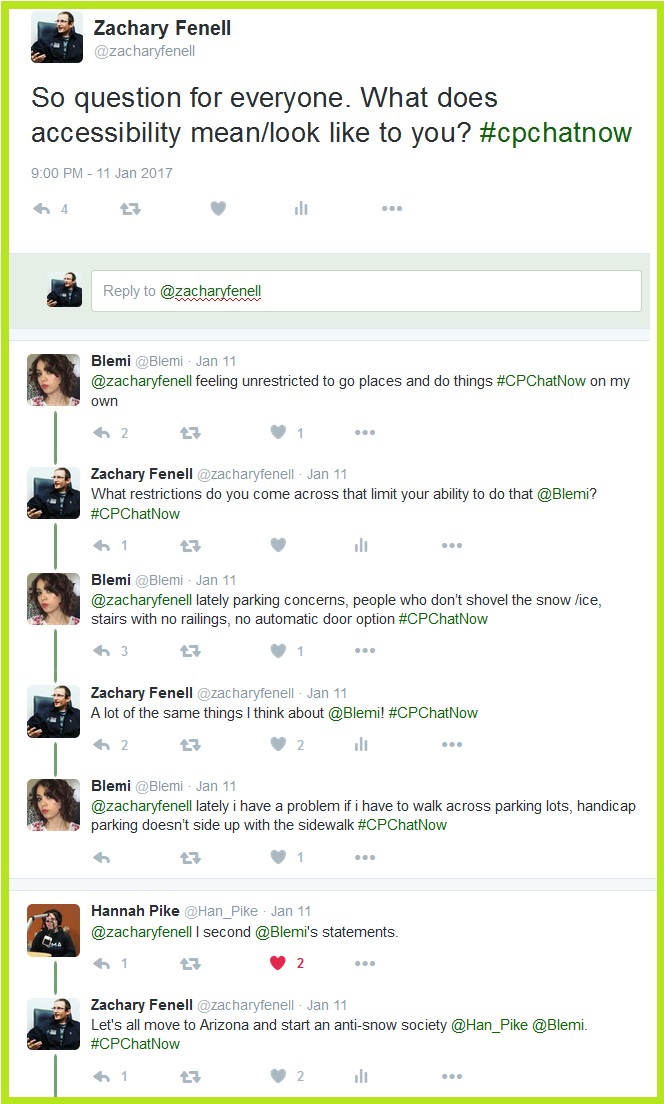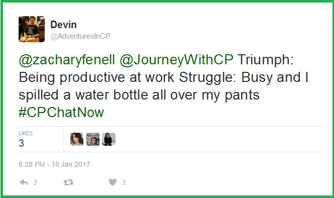 Cerebral palsy’s presence during daily activities proved a common theme throughout our live Twitter chat Wednesday, January 18th, 2017. I am #CPChatNow co-host Zachary Fenell and you know why I am here. To recap our latest Twitter chat!