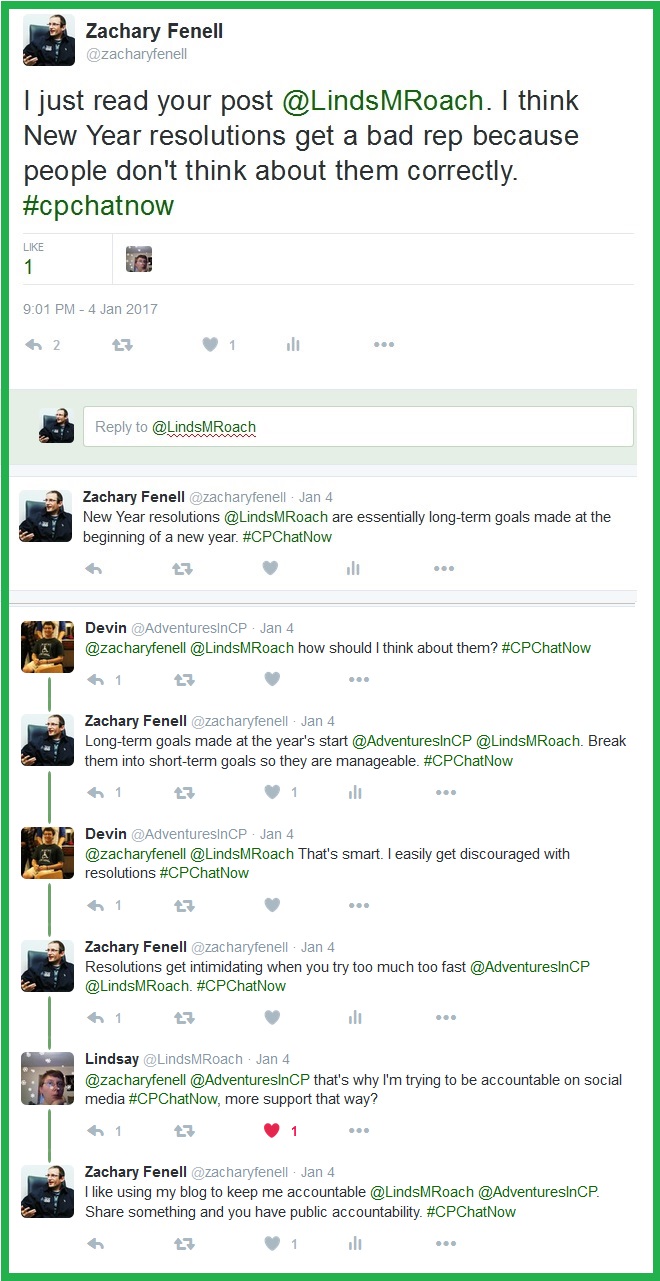 New Year resolutions naturally arose as a topic during #CPChatNow January 4th.Remember to keep your New Year resolutions manageable. Think practical and executable. Perhaps you will resolve to “Stay better connected to the #CPChatNow community by answering the weekly extend-the-conversation question.” In case you adopt the aforementioned, get started right. Answer the following.