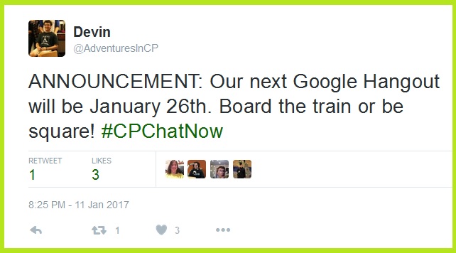 In the meantime make sure you join #CPChatNow tonight at 8pm ET. We will confirm details for our January focus chat. Additionally double check you marked your calendar for #CPChatNow’s January 2017 Google Hangout Thursday, January 26th. Contact Devin or I to inquire about receiving the invite. Finally, remember to answer the week’s extend-the-conversation question.