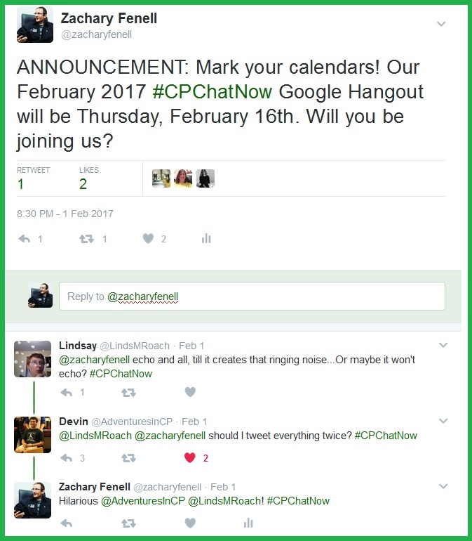 We welcomed a new member to the #CPChatNow Twitter chat family as Rachel who is teaching English in Spain joined us. She heard about us after reading Co-Host Zach Fenell and #CPChatNow co-founder John Quinn’s books and connecting via our Facebook page and monthly Google Hangout.