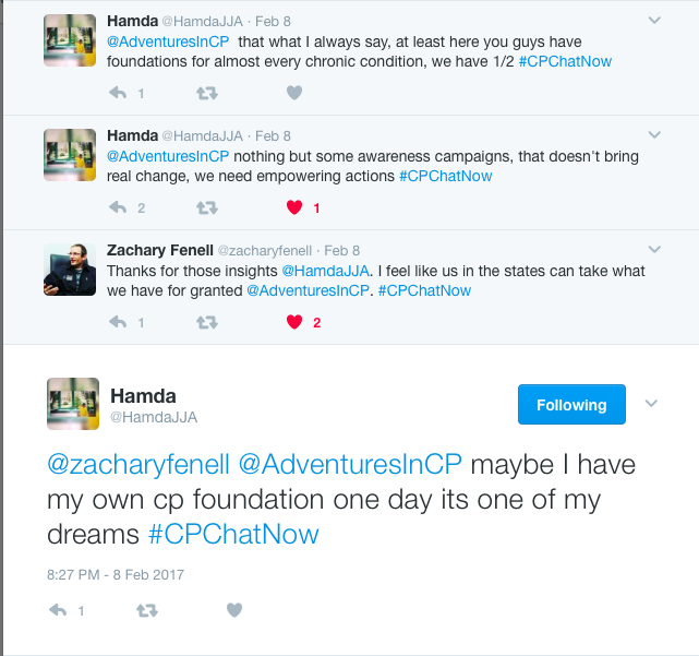 Finally, #CPChatNow member, Hamda, discussed her goal of having her own CP foundation in her home country one day to fill the void left by the lack of awareness organizations.