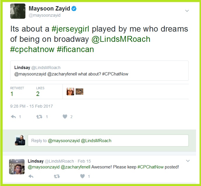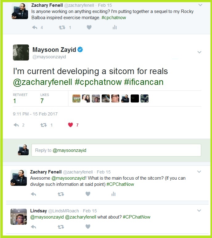 On Wednesday, February 15th we at #CPChatNow held our monthly focus chat for February 2017, welcoming to the chat comedian and actress Maysoon Zayid. Now I am #CPChatNow co-host Zachary Fenell, here to condense the evening down into our weekly recap. Rather than concentrating on a certain topic, we used our time with Maysoon for an open Q & A session.