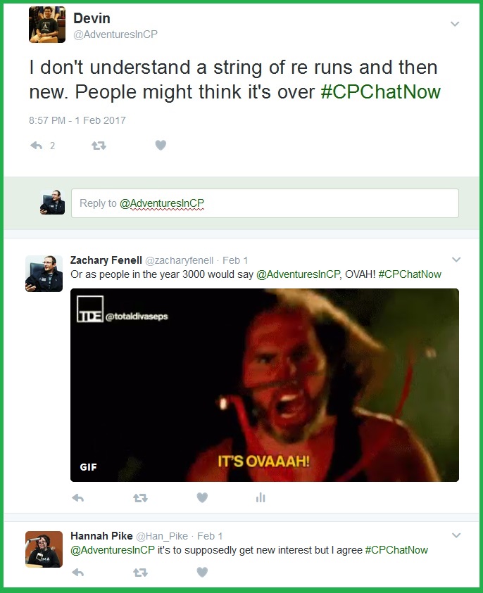 Devin continues to fill in admirably for co-host Blake Henry while Blake studies abroad. Tweets from Blake with the hashtag CPChatNow indicates our community remains on his mind. Although due to the time difference, said tweets come outside chat hours. So I thought to begin our February 1st chat by retweeting Blake’s latest update.
