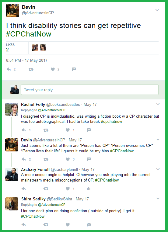 Many interesting topics emerged Wednesday, May 17th, 2017 during the weekly cerebral palsy Twitter chat #CPChatNow. Or at least I, co-host Zachary Fenell, found the subjects intriguing. Go ahead and use this recap to draw your own conclusions.