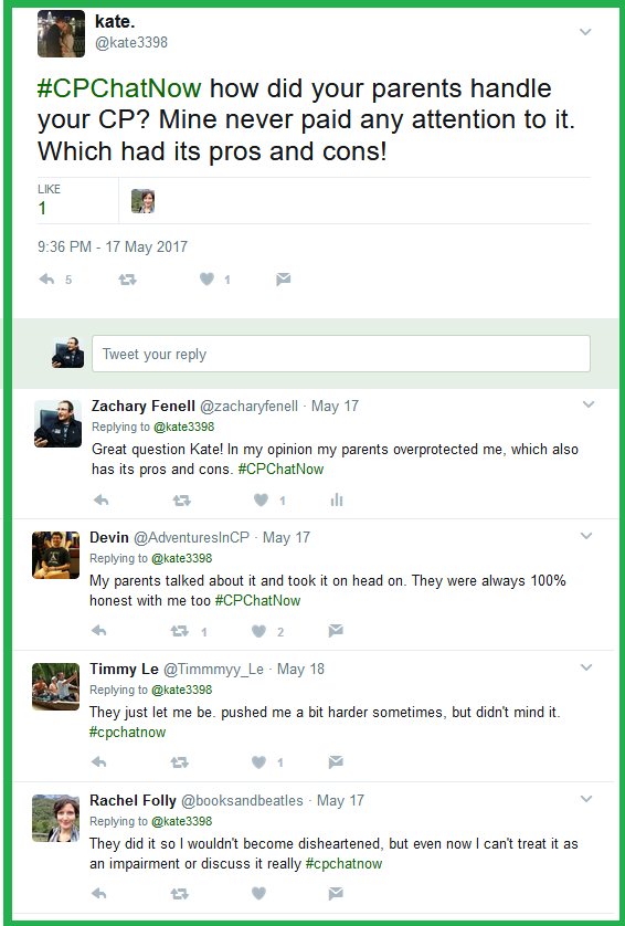 Co-host Devin Axtman reminds #CPChatNow that our May Google Hangout will be Thursday, May 25th.Towards the chat’s end a younger participant Kate initiated discussion asking others about how participants’ parents handled the cerebral palsy diagnosis. Replies demonstrated varying approaches taken.