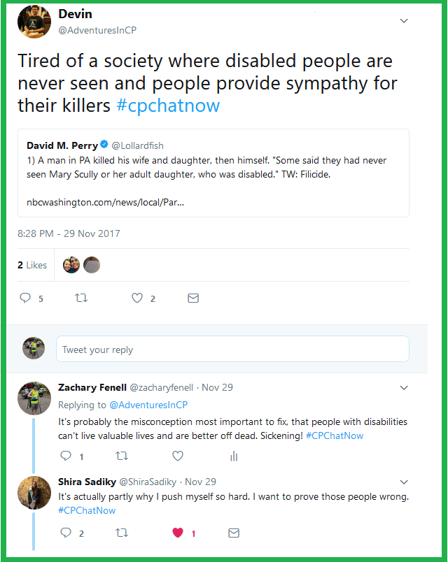 Similarly, I found the news piece sickening. I theorized such instances happen due to the misconception people with disabilities cannot live valuable lives. #CPChatNow regular Shira Sadiky chimed in, saying these unfortunate attitudes motivate her. She wants to prove those people wrong!