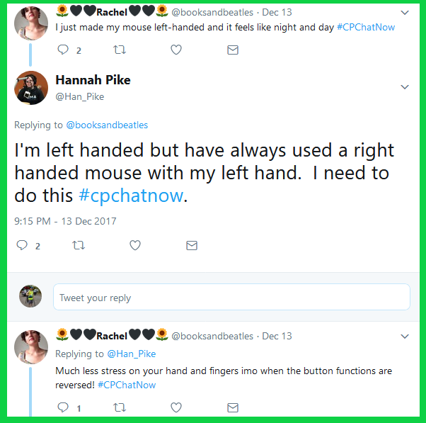 Rachel mentions making her mouse left-handed.Rachel noted she recently made her computer mouse left-handed. Hannah, also a lefty, expressed interest in doing the same. Personally, the entire conversation fascinated me.