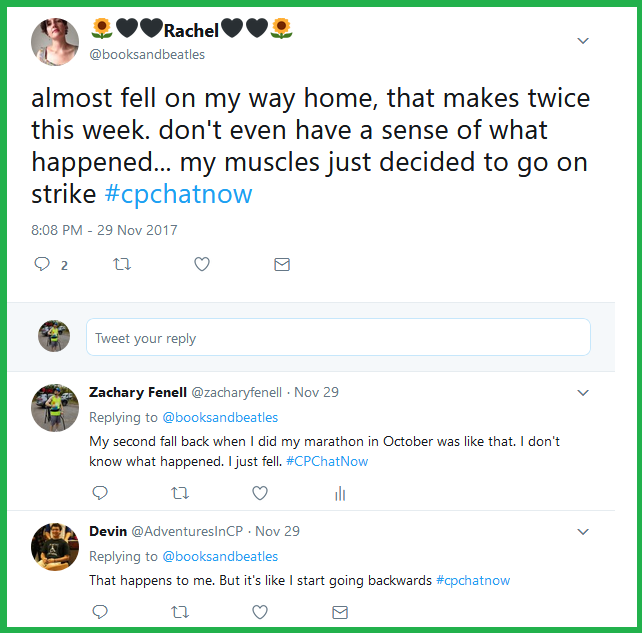 Assorted conversations occurred Wednesday, November 29th, 2017 during the cerebral palsy Twitter chat #CPChatNow. I am co-host Zachary Fenell, here to summarize the dialogue into your weekly recap. Tone throughout the night varied from empathetic and humorous to more serious.