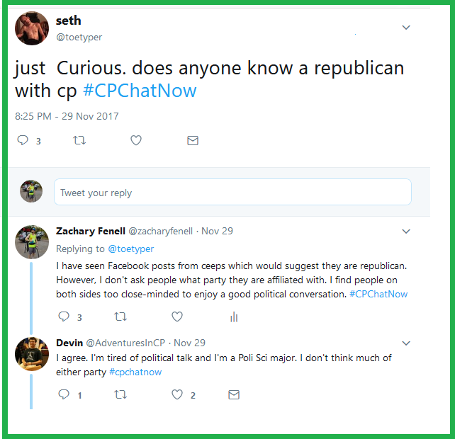 Seth asks if anyone knows a republican with cerebral palsy.Curiosity sparked Seth to ask if anyone knows a republican with CP. I mentioned seeing social media posts containing republican ideals published by others with CP. However, I added not asking about party affiliation. Close-minded attitudes make political discourse difficult to enjoy in my opinion. Devin agreed, expressing indifference towards the two main parties. Furthermore Devin voiced frustration regarding another subject.