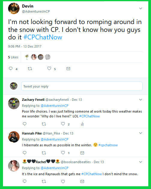 Wednesday, December 13th, 2017 remained an active evening for the live weekly cerebral palsy Twitter chat #CPChatNow. Organizing all the activity into one easy to follow recap stands my charge. For those who do not know I am co-host Zachary Fenell.