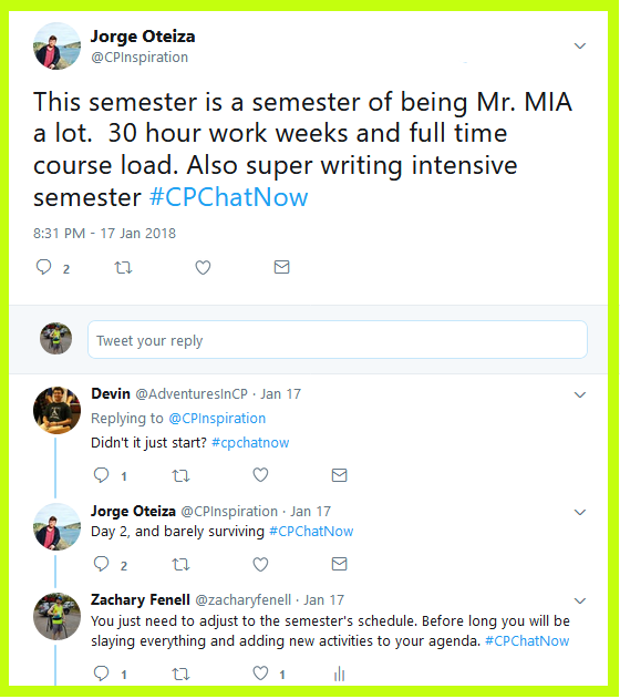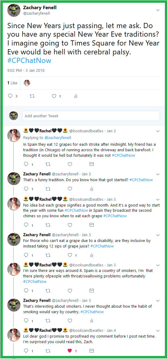 A New Year for the cerebral palsy Twitter chat #CPChatNow commenced Wednesday, January 3rd, 2018. I am co-host Zachary Fenell, here to happily recap our first 2018 chat. Unfortunately my counterpart Devin missed the evening’s festivities due to feeling under the weather. However, I proved not the only co-host around to kick off the year.