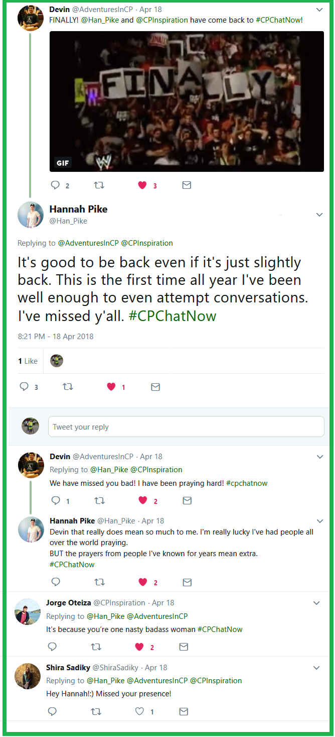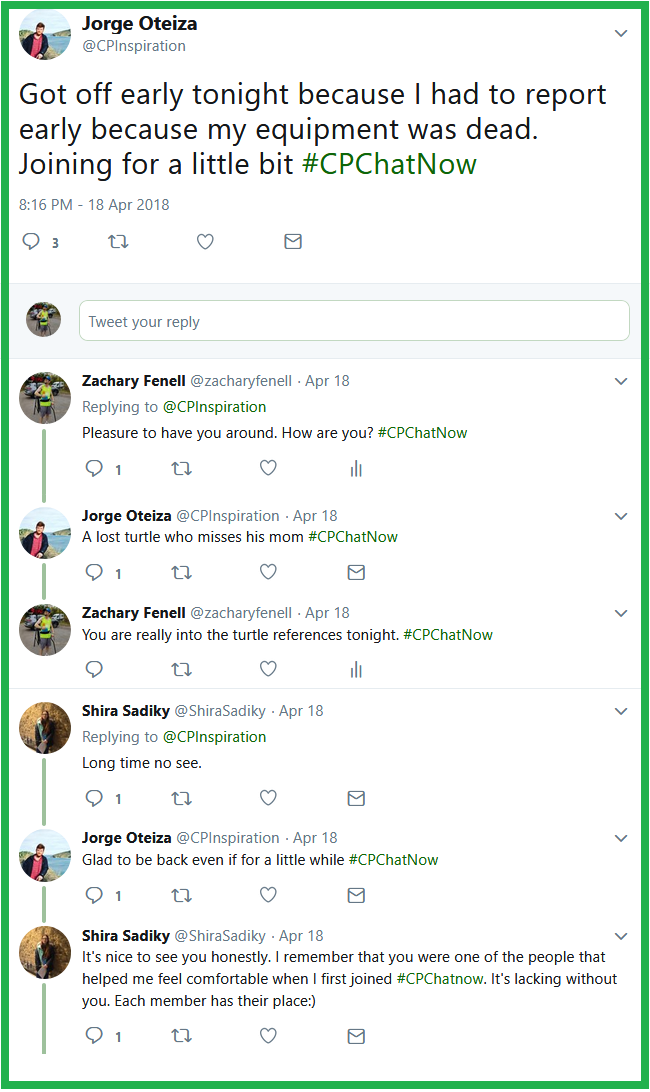Just like Hannah, participants excitedly met Jorge. Specifically, Shira Sadiky recounted how Jorge helped her feel comfortable when she first joined #CPChatNow a couple years ago. Comfort definitely stands important towards building a strong community.