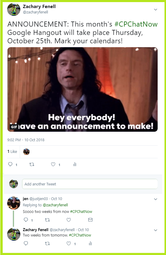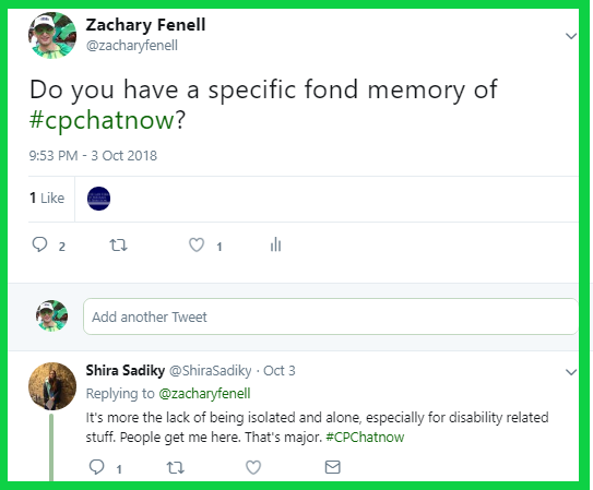 Your weekly cerebral palsy Twitter chat #CPChatNow started out on a despondent note Wednesday, October 24th, 2018. I am co-host Zachary Fenell here to tell you more, the best way I know how. Recap time!