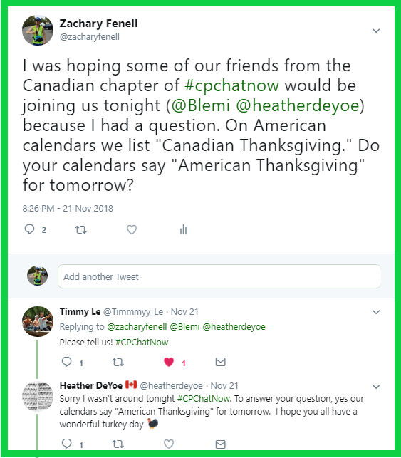 Before participants in the CPChatNow community gathered with loved ones to celebrate Thanksgiving, they assembled for the live cerebral palsy Twitter chat #CPChatNow Wednesday, November 21st, 2018. I am co-host Zachary Fenell, here to reminisce about the November 21st, 2018 chat the best way I know how. Your weekly recap!