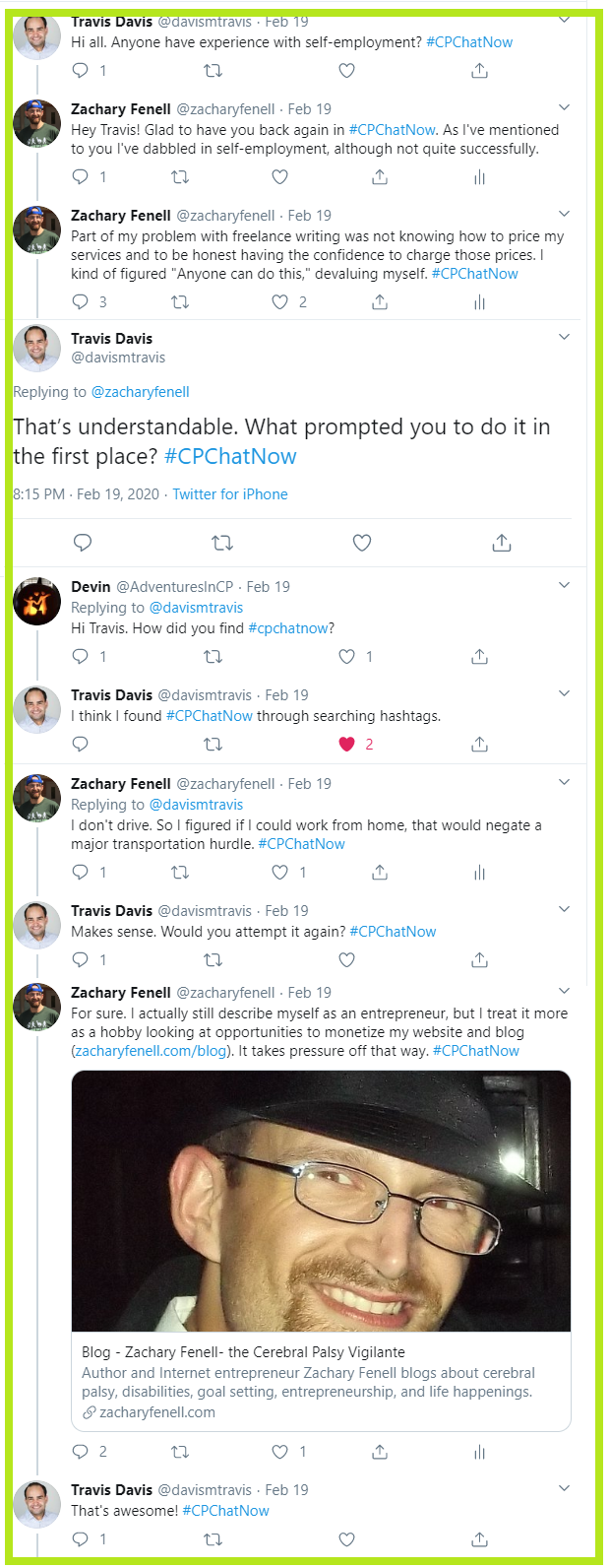 On Wednesday, February 19th, 2020 participants in the weekly cerebral palsy Twitter chat #CPChatNow enjoyed an assorted conversational spread. Keeping to the food analogy, that makes me co-caterer (oppose to co-host) Zachary Fenell. I invite you to come sample the discussion via our weekly recap.