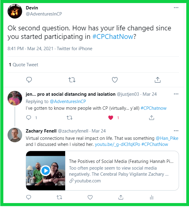 Long-time chat regular Jen answered the question, saying she has virtually gotten to know more people with CP. I responded, noting virtual connections can lead to real impact. A sentiment Hannah expressed with me in 2019 while recording a Youtube video “The Positives of Social Media.”
