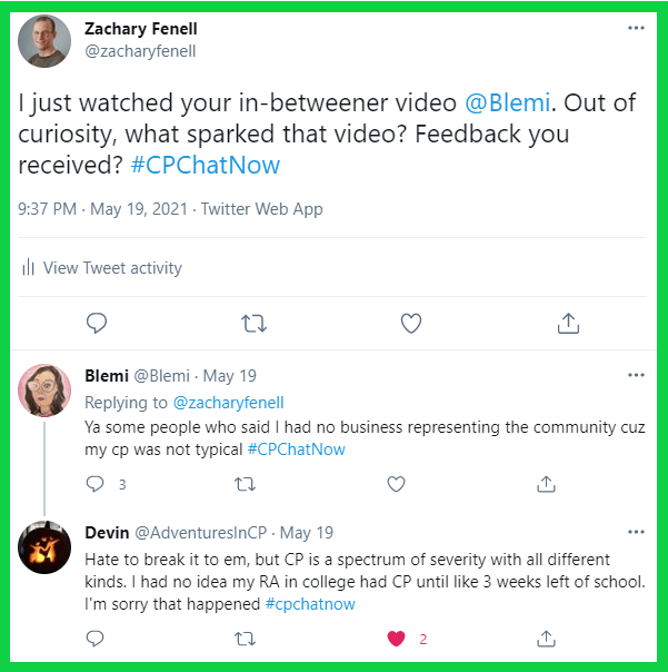 Quietly Wednesday, May 19th, 2021 snuck up on participants in the cerebral palsy (CP) Twitter chat #CPChatNow. Please allow me, chat co-host Zachary Fenell, to tell you more. Just keep reading.