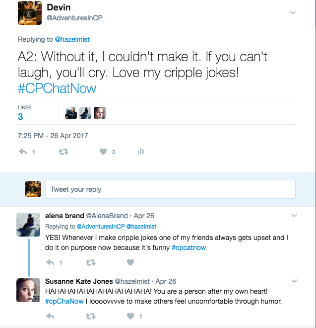 This brings us to our Extend-The-Conversation Question, “What role does humor or comedy play in your daily life with CP?” Extend the conversation question with #CPChatNow Logo