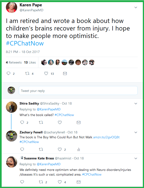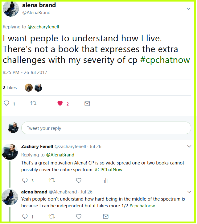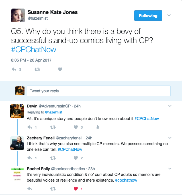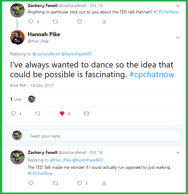 #CPChatNow was especially fantastic last week!  Longtime member, Rachel Folly, led a focus chat on the past year in members’ lives and developments for adults with CP.
