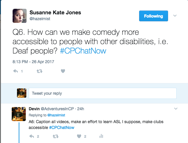 Next, Susanne asked if comedy could be used to teach about disability related issues. Members largely agreed that it can allow others to relate to CP easier.