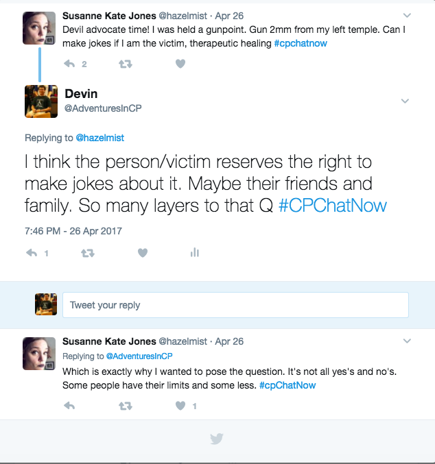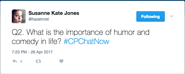 This week brought up one of our best focus chats yet, as #CPChatNow regular, Susanne Kate Jones, led a serious chat about comedy.  I’m your #CPChatNow Interim Co-Host, Devin Axtman, taking you along for the ride. So, what are you waiting for?  Hop aboard and let’s get geauxing!