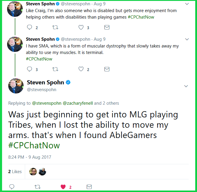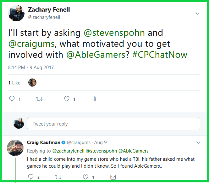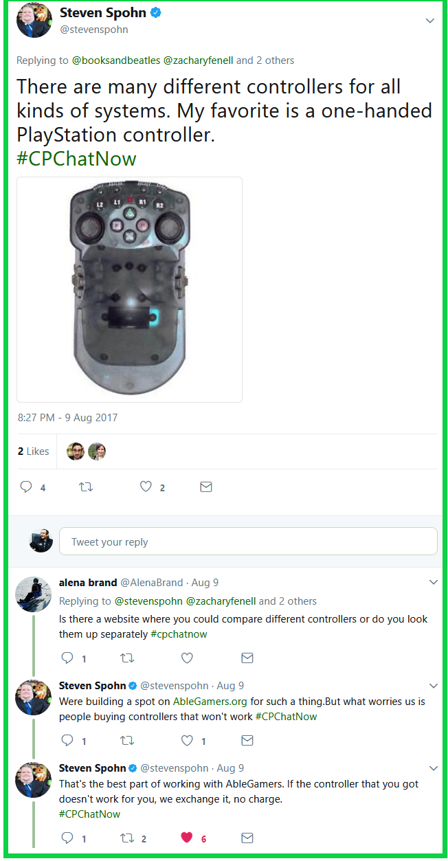 Representatives for the 501(c)(3) charity AbleGamers joined the cerebral palsy Twitter chat #CPChatNow Wednesday, August 9th, 2017. We  welcomed guests Steven Spohn (COO) and Craig Kaufman (Program Director) as they led us in a focus chat about accessible gaming. Personally for me, #CPChatNow co-host Zachary Fenell, the evening proved extra neat because I actually went to junior high and high school with Craig. However, I am sure you could care less about that! So let us get to what does interest you, accessible gaming!