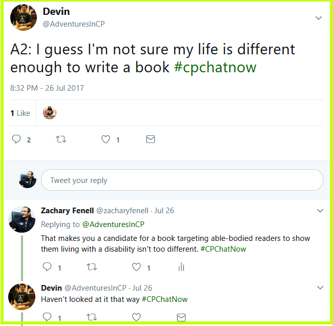 Zachary asks #CPChatNow participants about what CP books stand out to them.Now I prefaced the question, explaining the importance behind knowing similar books already published. That way you can try emulating the attributes which worked for other authors. In her response to the first question regular Shira Sadiky complimented my memoir, calling Off Balanced “relatable.” I noted I felt the same relation reading Someone Like Me. Co-host Devin Axtman also praised John Quinn‘s work.