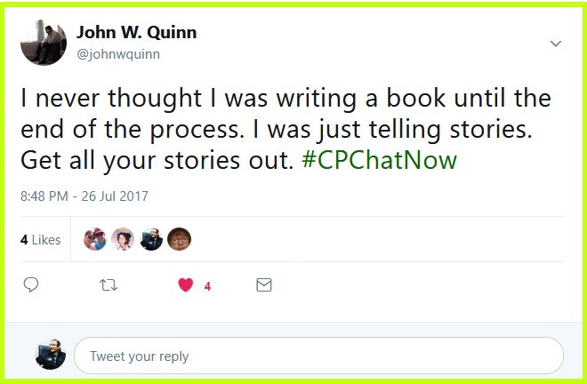 Zachary Fenell gets #CPChatNow participants to think like a writer and reflect on why you would write a memoir.
