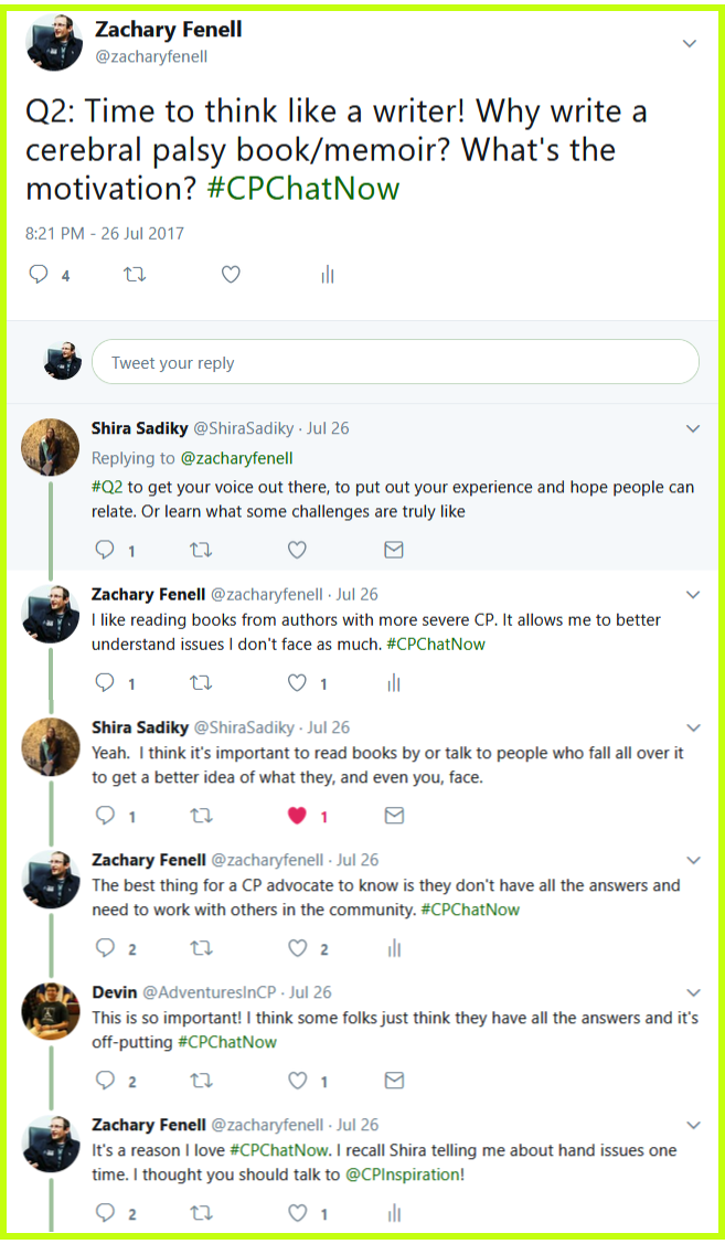 Writing a cerebral palsy book or memoir remained the subject for #CPChatNow Wednesday, July 26th, 2017. Yours truly, co-host Zachary Fenell, enjoyed the pleasure to lead the focus chat. I prepared seven discussion questions based off my experiences writing and publishing my CP memoir Off Balanced. However I proved not the only author around to chat July 26th.