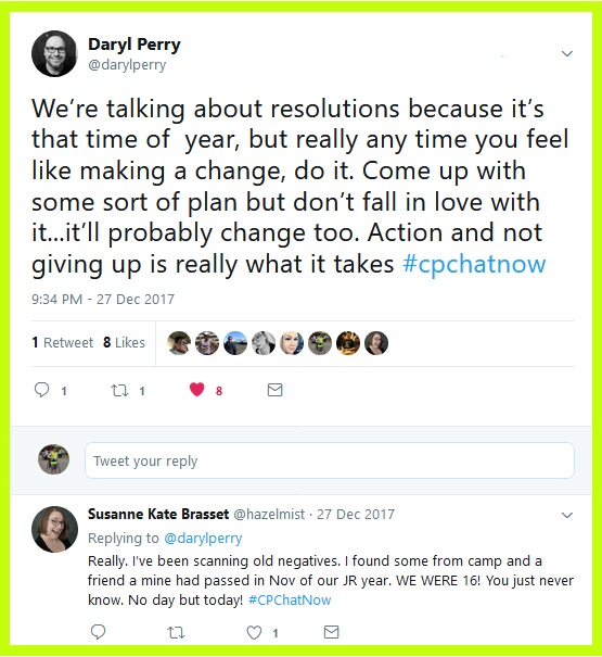 Happy New Year! We in the #CPChatNow community prepared for the occasion Wednesday, December 27th, 2017 when we welcomed guest Daryl Perry to lead our “Setting Good New Year Resolutions” focus chat. I am co-host Zachary Fenell and you likely know my intentions. To summarize the dialogue from December 27th, 2017 into your weekly recap!