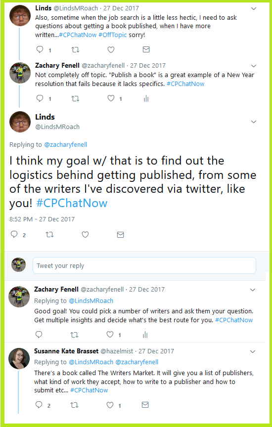 Linds brainstorms New Year resolutions to help aid her aspirations to become an author.Particularly Linds pondered seeking knowledge from already published authors. Susanne suggested another resource too, the book The Writers Market. Further chatter about writing resources progressed alongside other topics.