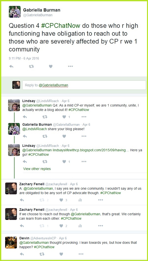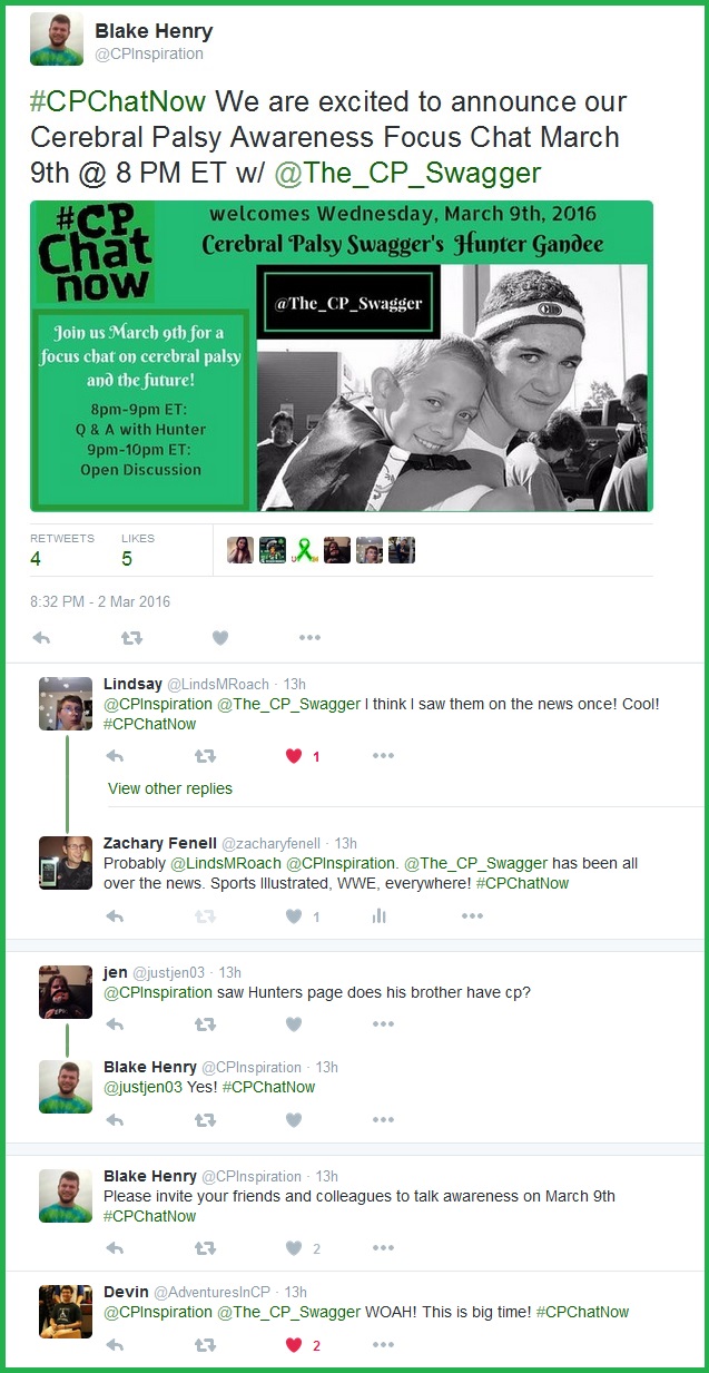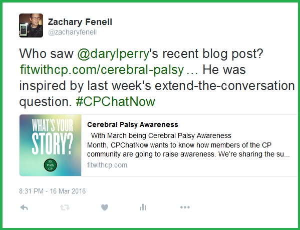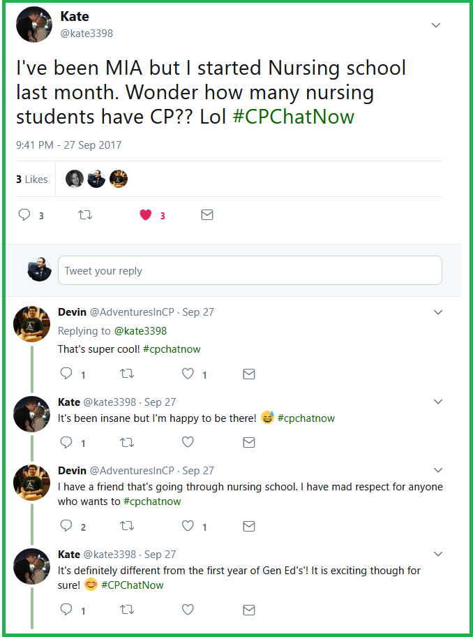 With December 3rd approaching, I asked the community to fill in the blank and answer, “Thanks to #CPChatNow, I am more _____.” Devin replied, saying our community has made him more, “confident in my disability identity.” Devin would go on to discuss how #CPChatNow has allowed us to meet, “super cool people that have done stuff with CP,” and “meet people (with CP) all over the country and even the world.”