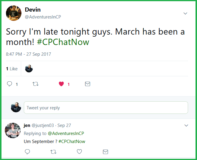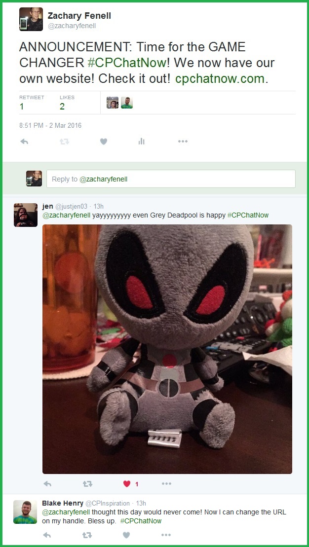The fact nine years has passed since our community’s first chat, wowed an enthusiastic fixture in our community, Chris. Reacting to the milestone, Chris tweeted, “9!?!?! Omg! I guess it has been, but wow!” Retweeting Chris’s response, I thanked everyone who has given our community staying power. Those individuals include both long-time community members and new faces. One new face in-particular shared his own #CPChatNow milestone.