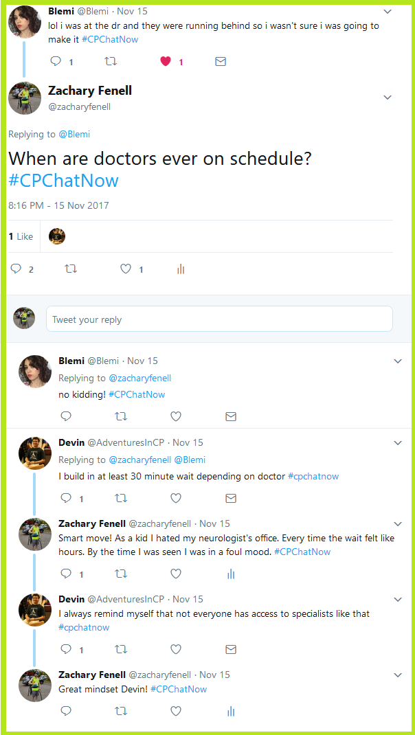 Participants in the live cerebral palsy Twitter chat #CPChatNow enjoyed thought provoking conversation Wednesday, November 15th, 2017. I am co-host Zachary Fenell, here to capture the riveting dialogue and allow you to further contemplate the various topics discussed. My co-host Devin Axtman provoked thought early as Blemi and I discussed wait times at the doctor.