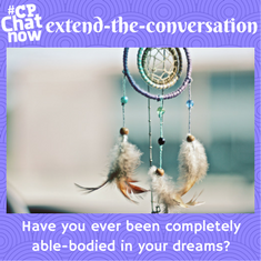 Linds asked if anyone in #CPChatNow is ever able-bodied in their dreams. Linds asked if anyone else ends up in their dreams either able-bodied or possessing super strength. Both Seth and I never experienced those abilities in our dreams, but what about you? Answer for the week’s extend-the-conversation question, “Have you ever been completely able-bodied in your dreams?”  Leave your response in the “Comments” section!