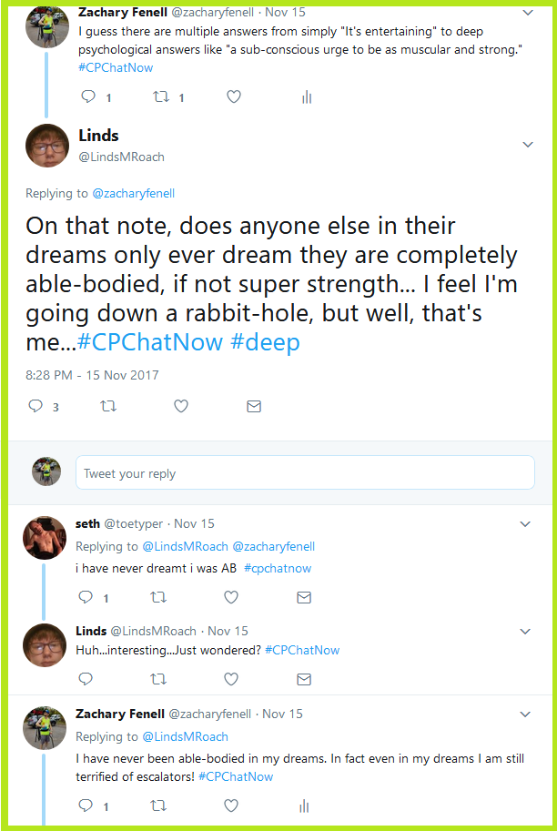 Dreams emerged another popular topic during the chat November 15th. Seth wondered why so many guys with CP watch wrestling. In my response I suggested a possible “sub-conscious urge to be as muscular and strong.” That idea led Linds to transition the topic to dreams.