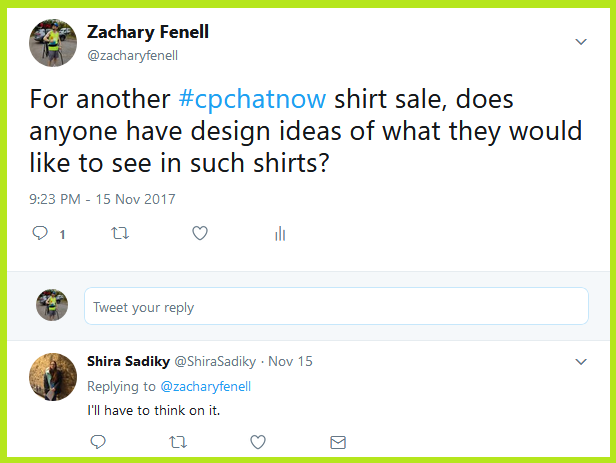 #CPChatNow co-hosts want your design ideas for the next #CPChatNow shirt.Think like Shira and let us co-hosts Devin, Jorge Otezia, and I know your design ideas for the next #CPChatNow shirt. Before sharing your shirt ideas with us though, remember the extend-the-conversation question awaiting your response.