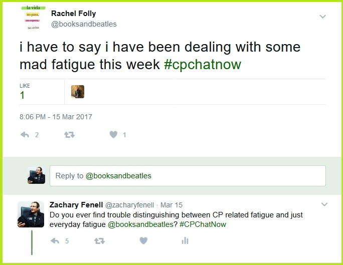 Rachel shares battling fatigue throughout the week..Now my response asking about a difference between CP related fatigue and everyday fatigue sparked some chatter. Specifically, whether there actually exists a difference.