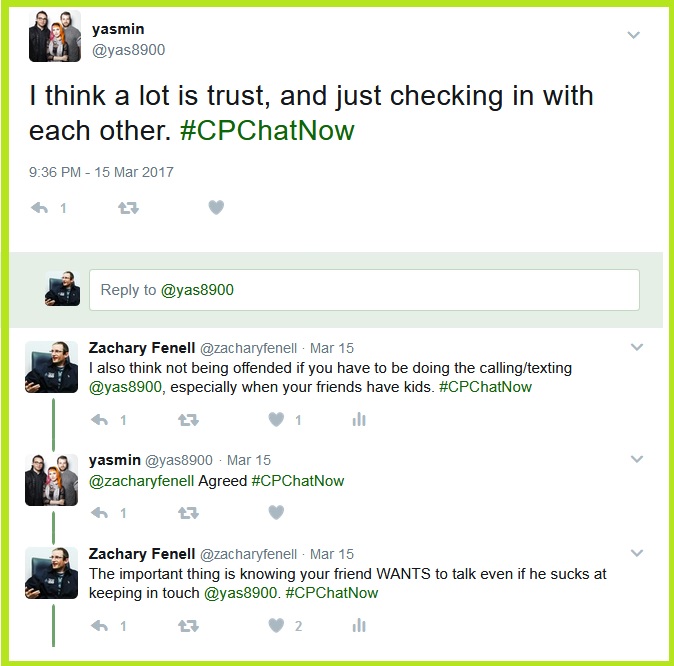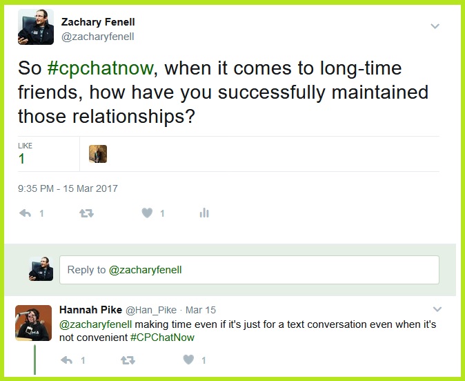 Zachary asks how #CPChatNow participants successfully maintain long-time friendships.#CPChatNow regular Hannah Pike identified making time as an important task. Yasmin meanwhile spoke about trust.