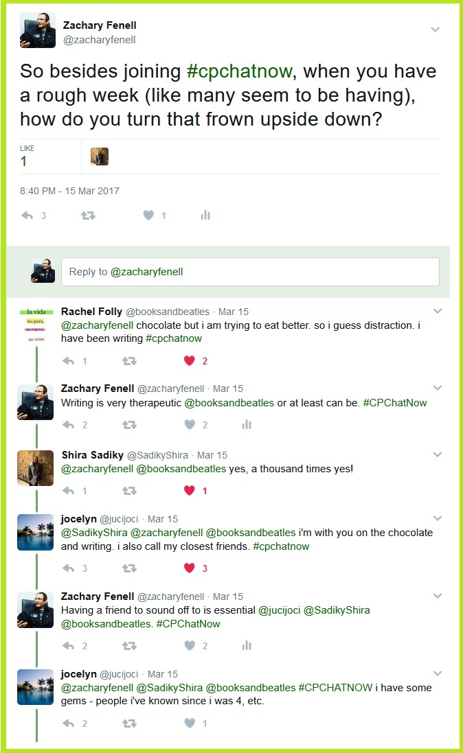 #CPChatNow co-host Zachary Fenell wants to know how participants turn their frowns upside down.Yasmin shares activities she does to feel better.Jocelyn’s response in-part segued the conversation to another topic, friendships. More precisely how to maintain strong friendships while the years progress on. So staying friends when living in different states and starting families. You know, those adult life related issues!