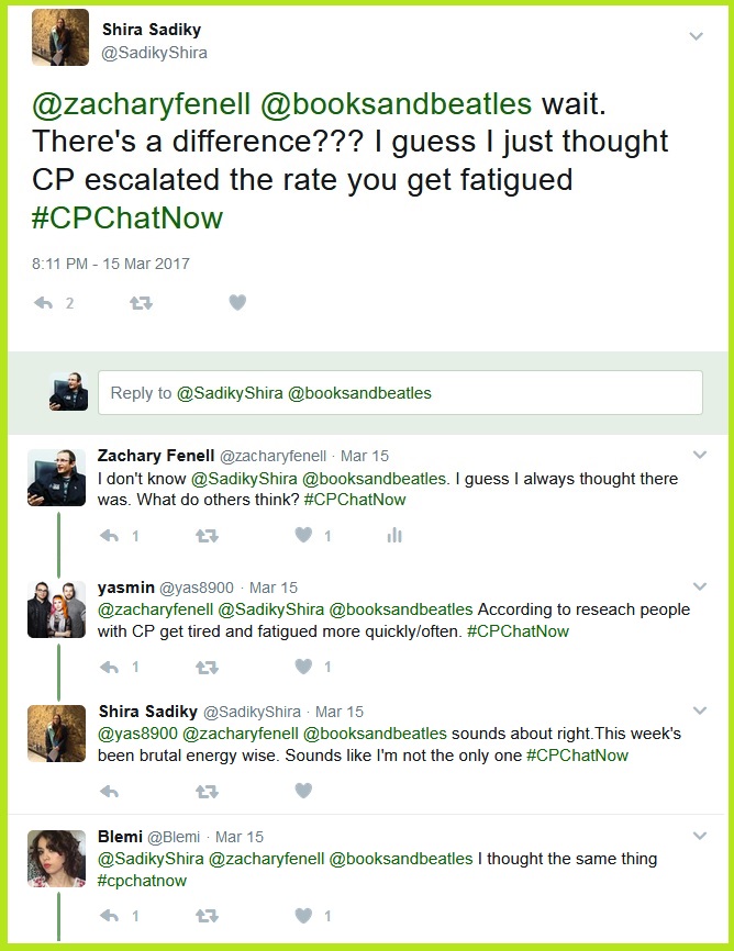 #CPChatNow participants discuss the relation between fatigue and cerebral palsy.Looking to expand beyond troubles to solutions, I asked how others cheer themselves up when facing hard times.