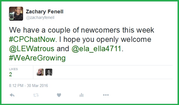 Fellow regular Linds greeted Hannah using a fun dancing GIF. Meanwhile both my co-host Devin and I expressed our excitement to see Yasmin again. Yasmin’s presence represents a dedication towards our chat considering in her time zone #CPChatNow happens at 1am!