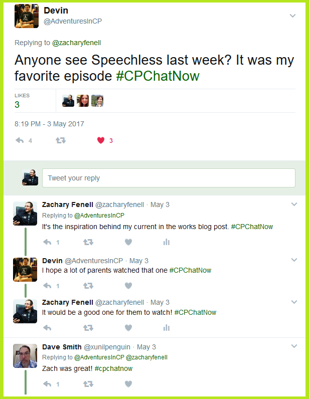 Participants in the live cerebral palsy Twitter chat #CPChatNow proved anything but speechless Wednesday, May 15th, 2019. I am #CPChatNow co-host Zachary Fenell here to recap our community’s response to Speechless‘ cancellation. The subject remained the conversation’s main concentration throughout the night.